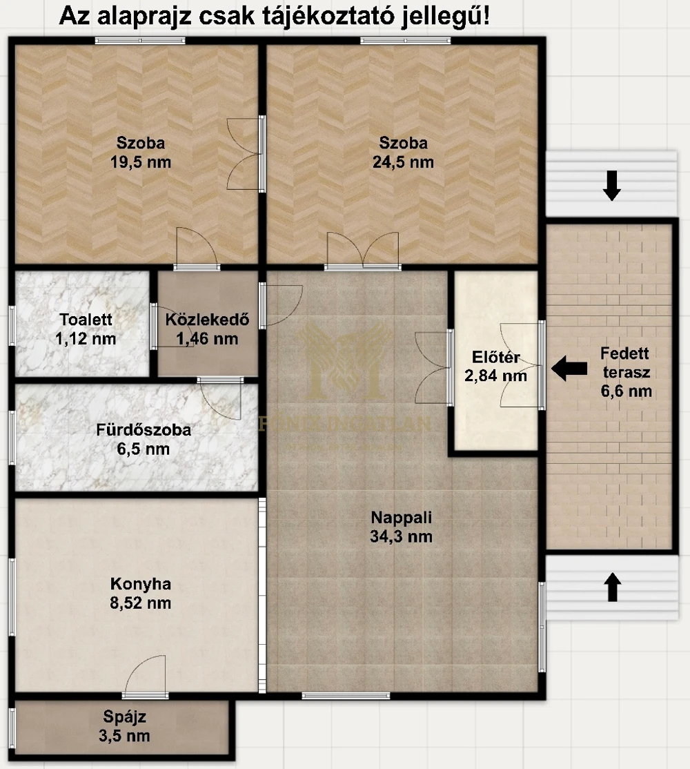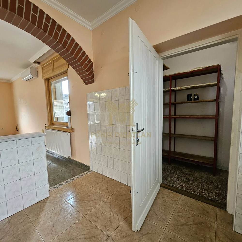 Az ingatlan elrendezése átgondolt és élhető: két tágas szoba, egy világos nappali, amelyből közvetlenül nyílik a konyha és a spájz, továbbá fürdőszoba, külön mellékhelyiség és egy előszoba biztosítja a kényelmet.